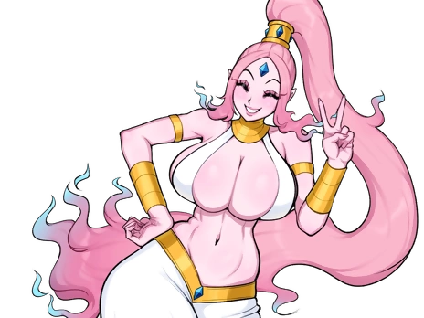 As she experiments, a mystical genie figure appears, adding a fantastical twist to the experience, accompanied by a vividly detailed cock-shaped accessory that enhances the excitement.