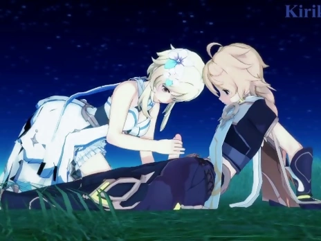 Lumine and Aether have intense sex in the meadow at night. - Genshin Impact Hentai